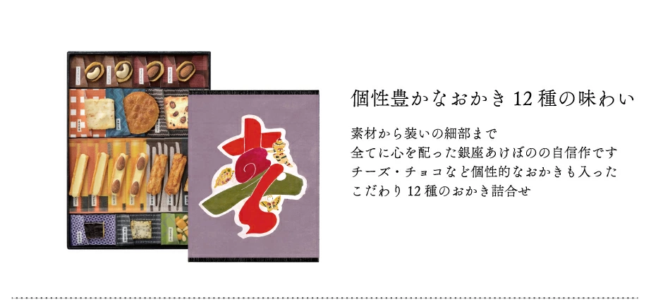 チョコカシューナッツ1、揚げ塩3、揚げ醤油3、松の実あられ1、 黒豆おかき1、草加小丸1、海苔羽衣1、海老焼塩1、胡麻白醤油1 |