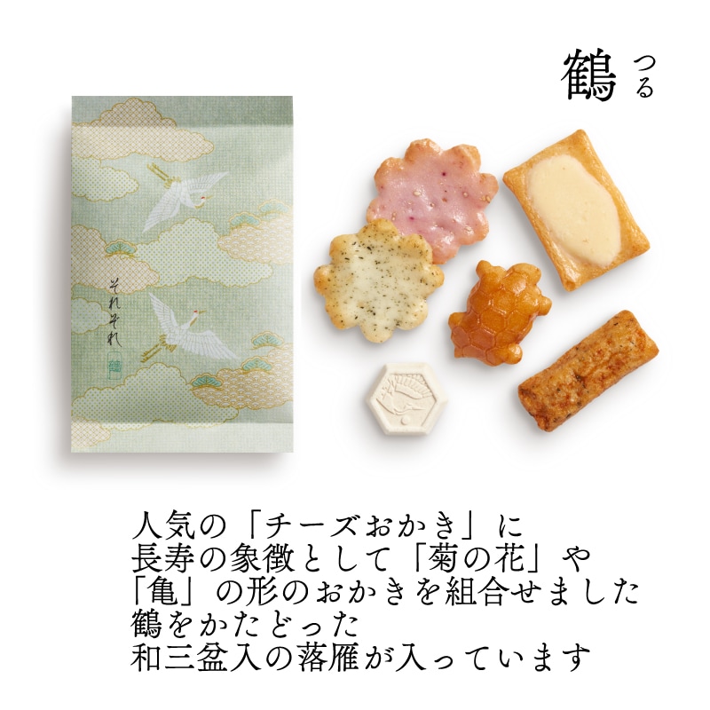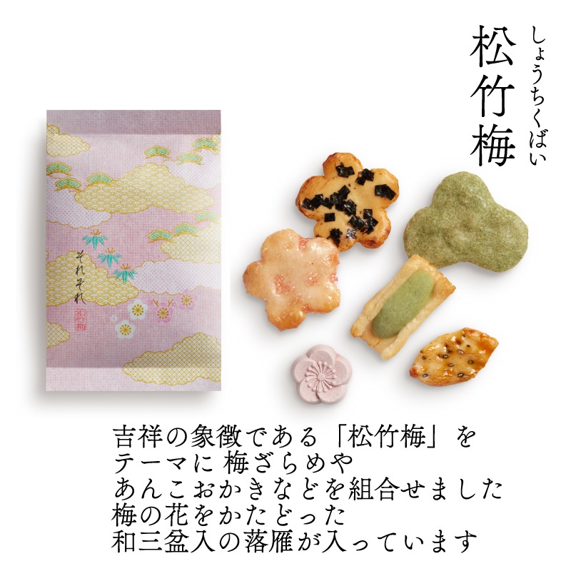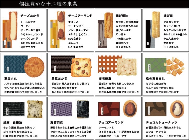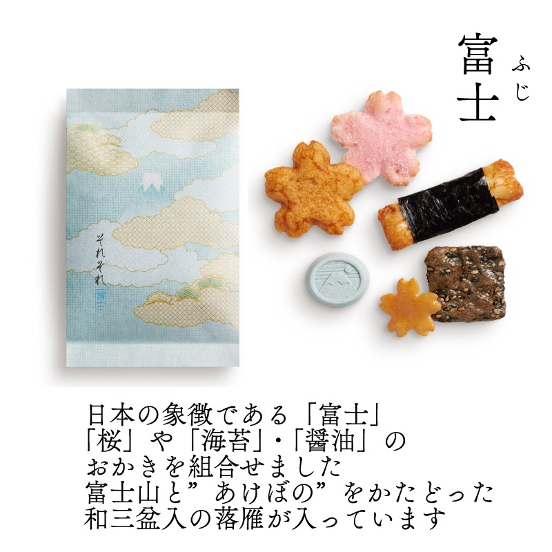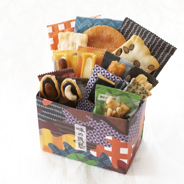 | 内容量 | 【それぞれ6袋入】富士×2袋、松竹梅×2袋、鶴×2袋 【味の民藝 袋(12種12個入)】チーズおかき1、アーモンドチーズ1、チョコアーモンド1、チョコカシューナッツ1、揚げ塩1、揚げ醤油1、松の実あられ1、黒豆おかき1、草加小丸1、海苔羽衣1、海老焼塩1、胡麻白醤油1 【季節限定】あんカラッと(4袋入)×1点 【生菓子】姫栗もなか小倉あん・白あん×各2個ずつ |